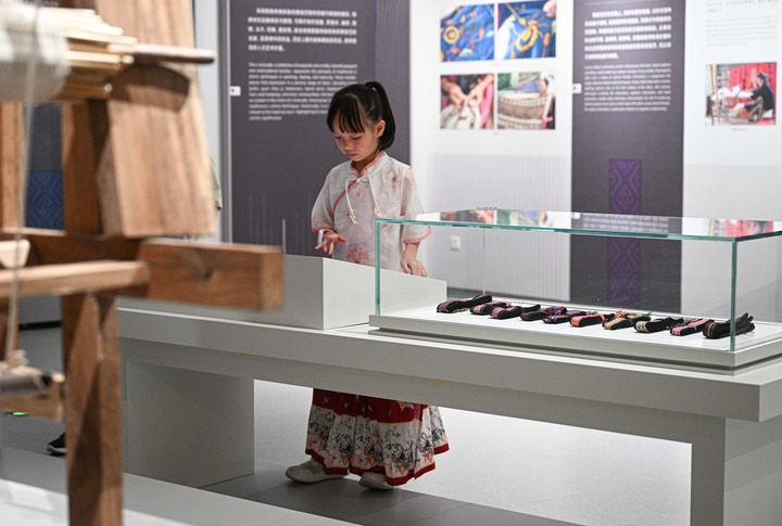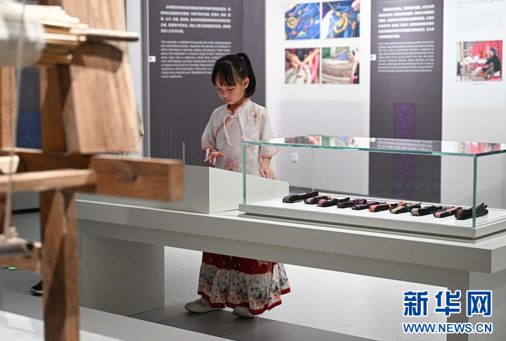 7月27日,在位于海口的海南省非遗展示中心,小朋友观看黎锦纹样。