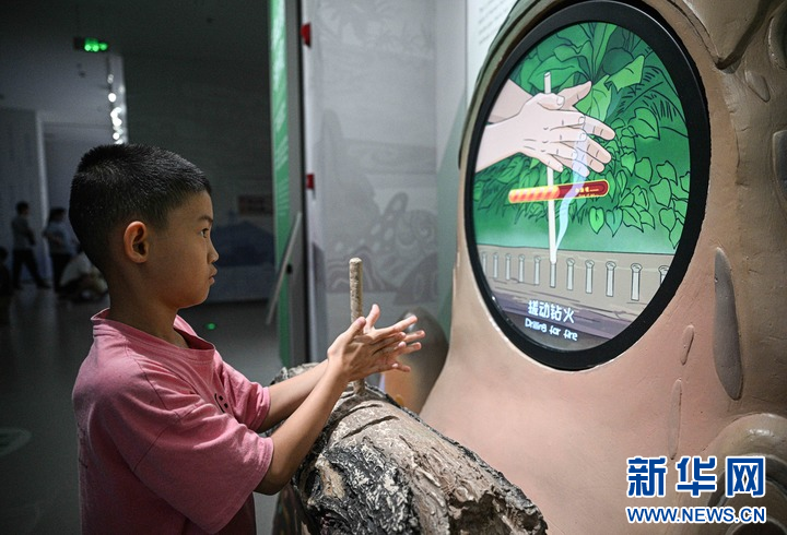 7月27日,在位于海口的海南省非遗展示中心,小朋友体验黎族钻木取火技艺。