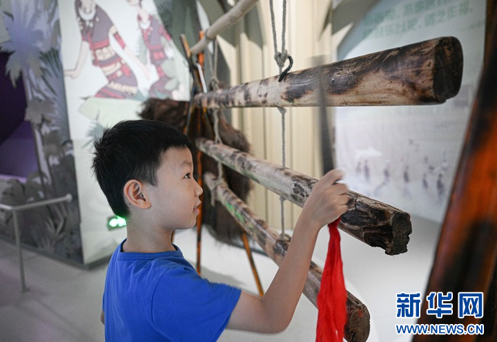 7月27日,在位于海口的海南省非遗展示中心,小朋友体验黎族敲击乐器叮咚。