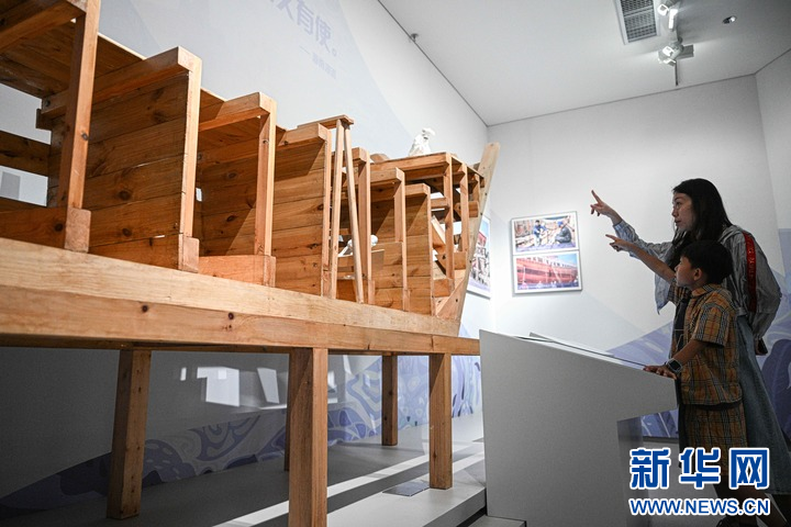 7月27日,在位于海口的海南省非遗展示中心,小朋友和家长观看临高广船造船技艺。