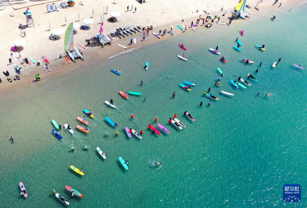8月10日,游客在三亚市后海村附近海域冲浪嬉水(无人机照片)。新华社记者 郭程 摄