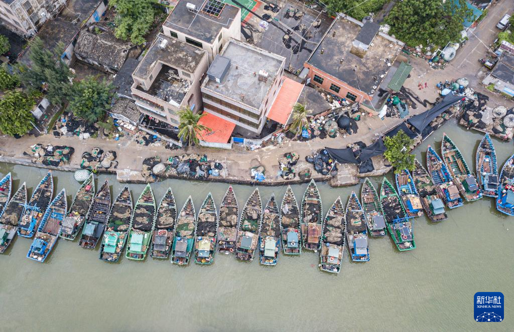 8月16日,大批渔船在海口三联渔港避风,暂缓出海(无人机照片)。新华社记者 蒲晓旭 摄