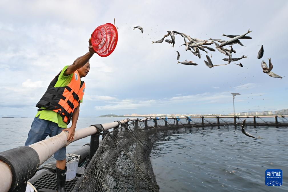 9月17日,陵水黄鳍金枪鱼海上养殖示范基地工作人员在投喂金枪鱼。新华社记者 郭程 摄