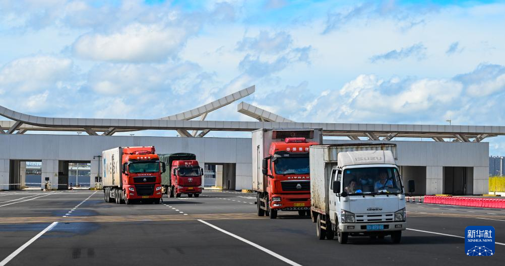 9月17日,离岛货车通过海口新海港和南港“二线口岸”(货运)集中查验场,开往港区。新华社记者 杨冠宇 摄