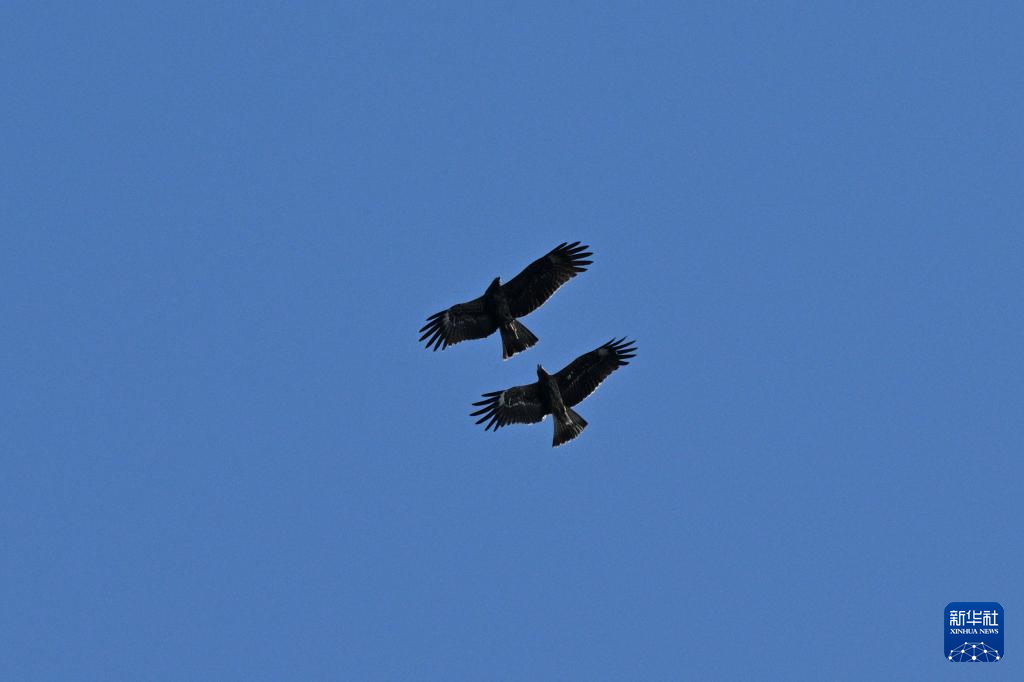 10月2日,两只黑鸢在海南昌江海尾国家湿地公园上空追逐。新华社记者 蒲晓旭 摄