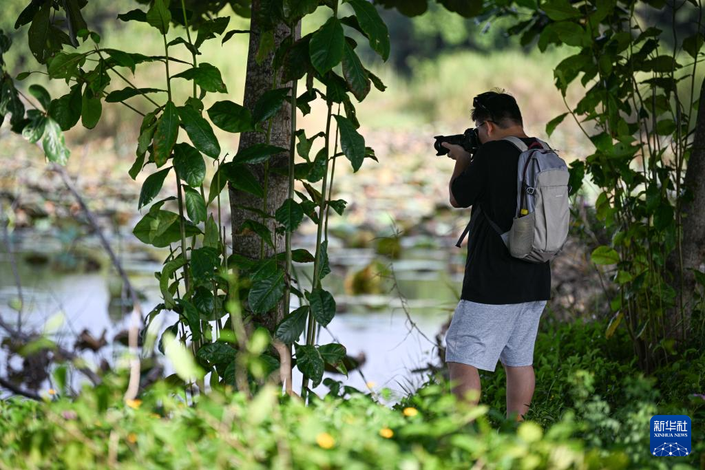 10月3日,游客在海南昌江海尾国家湿地公园游玩、拍照。新华社记者 蒲晓旭 摄
