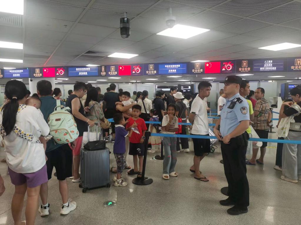 10月3日,海口新海港迎来客流高峰。该站执勤一队一边加强免签外国人离岛管理,一边热情为进出岛旅客提供引导和咨询。
