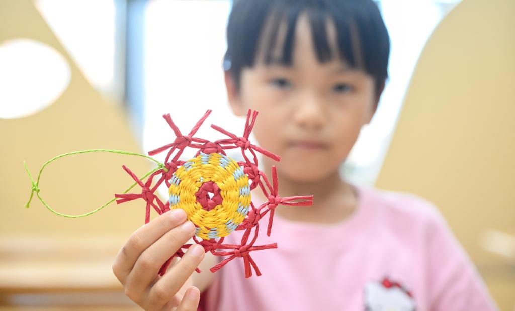 10月12日,在海南省文化馆,小朋友学习东山草编技艺。新华社记者 杨冠宇 摄