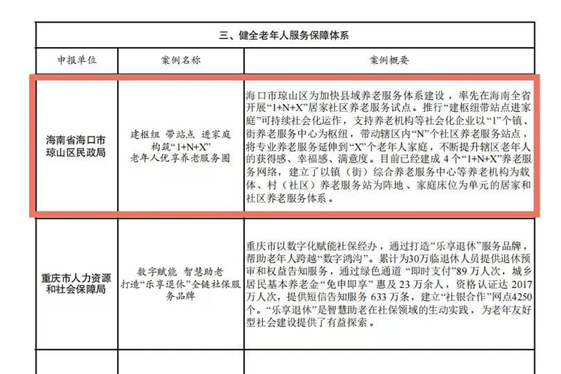 海口市琼山区作为海南省先行试点区域,率先探索“1+N+X”居家社区养老服务模式:推行“建枢纽带站点进家庭”可持续社会化运作,支持养老机构等社会化企业以“1”个镇、街养老服务中心为枢纽,带动辖区内“N”个社区养老服务站点,将专业养老服务延伸到“X个老年人家庭”,不断提升辖区老年人的获得感、幸福感、满意度。