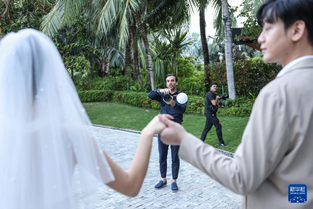 “很好,很漂亮!脸稍微往右转一点……完美!”“走动一下,看着我,笑一下。真是太美了!”在海南三亚湛蓝的海岸线边,法国摄影师卢多维克·埃里克正忙着为一对中国新人拍摄婚纱照。